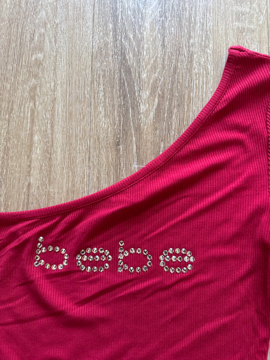 Y2K Women’s Bebe Bedazzled Off The Shoulder Red Logo Longsleeve Tee